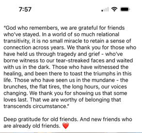 The next morning the devotional I read on Facebook (included in full) didn’t help matters any. It eloquently extolled the virtues of old friends who have seen you through all aspects of life—the highs, the lows, the in-betweens. I’ll never make friends like that again. First, I’d had to leave the people of Lavelle, now all our friends in our hometown of 40 years.