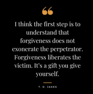 Over the years, I have become something of a student of forgiveness. I learned that forgiveness doesn’t mean saying that what they did was okay or even that the relationship needs to be restored or continued. It isn’t about the other person; it is about you. One of my favorite quotes, which has been a game changer for me, is from Lewis B. Smedes: “To forgive is to set a prisoner free and discover that prisoner was you.”